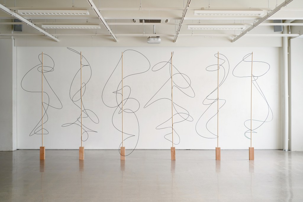 compress2020-01 2020年3月23日2020年4月9日 | 小形麻依 W:120/D:120/H:270(cm)2020.1POM樹脂丸棒、木材 1_(1)1_(2)2_(1)2_(2)3_(1)3_(2)4_(1)4_(2)5_(1)5_(2)6_(1)6_(2)1〜3は支持体の丸棒に地面に対して水平な孔を開け、4〜6は支持体の丸棒に地面に対して45度傾けた角度で孔を開けた。孔の角度によって曲線の可動域に制限が生まれるため、線の動きに差が生まれる。また、鑑賞者の立ち位置によって樹脂棒の描く曲線は異なる表情を見せている。 共有: クリックして X で共有 (新しいウィンドウで開きます) X Facebook で共有するにはクリックしてください (新しいウィンドウで開きます) Facebook いいね 読み込み中… 関連